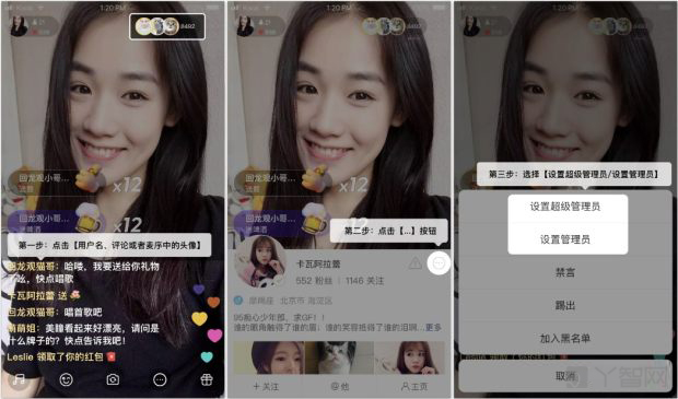 3、如何設(shè)置直播間管理員? 在直播間中點(diǎn)擊觀眾的頭像或用戶名,再點(diǎn)擊彈窗頁面右上角的[…],選擇“設(shè)為管理員”或“設(shè)為超級管理員”即可。 注:超級管理員設(shè)置不超過 10 個,普通管理員設(shè)置不超過 50 個。