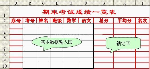 如何通過先excel單元格鎖定的格式,在將鎖定保護的單元格的數據隱藏起來。將重要的數據鎖定并且隱藏保護起來。然后可以更改沒有設置保護的單元格數據,怎么操作呢?小編通過考試成績的案例來分析吧。如圖所示:需要將紅色設置為鎖定區,黑色為數據輸入區。