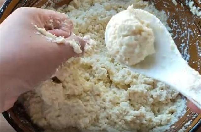 2.豆腐放入一個較大的碗中,放入三大勺淀粉,這樣能夠使口感更Q彈,加入少許的鹽,調一個底味按碎,然后我們可以用手像這樣把它做成丸子的形狀,也可以用裱花袋擠一下。