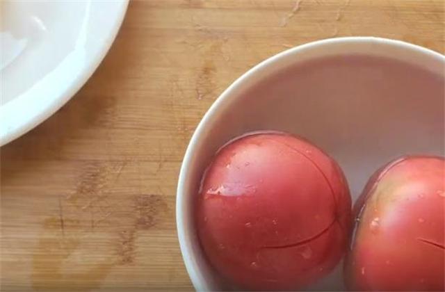 1.今天和大家分享用豆腐和西紅柿做的美食。準備一塊大豆腐,兩個西紅柿,在西紅柿的表皮劃十字花刀,然后用開水浸泡一下去皮。(www.Ws46.com)
