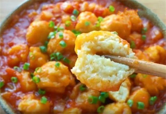 7.西紅柿本身就含有水分,全程不用加一滴水,加一點蔥花點綴,這樣我們的茄汁豆腐丸子就做好了,酸甜咸鮮,口感滑嫩,真的是開胃又下飯。 |
