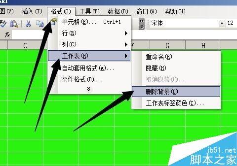 6、若我們想把綠色背景取消。在菜單欄中順序點:格式--工作表--刪除背景。 工作表即恢復原狀。