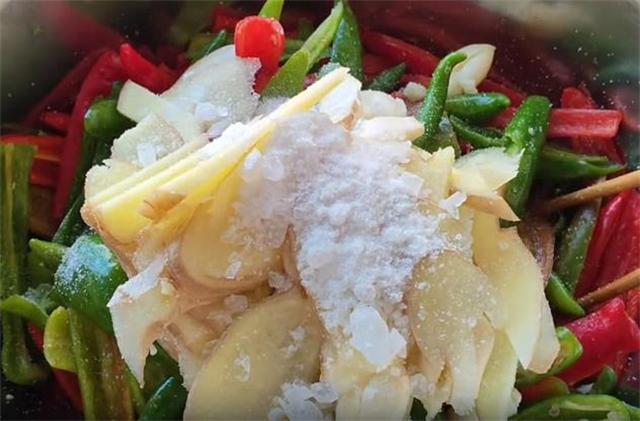 4.把所有準備好的配料放入辣椒中,再加入少許的鹽,不要放太多,因為本身醬油就是咸的,攪拌均勻,腌制2個小時以上,這樣先腌制辣椒會更入味。