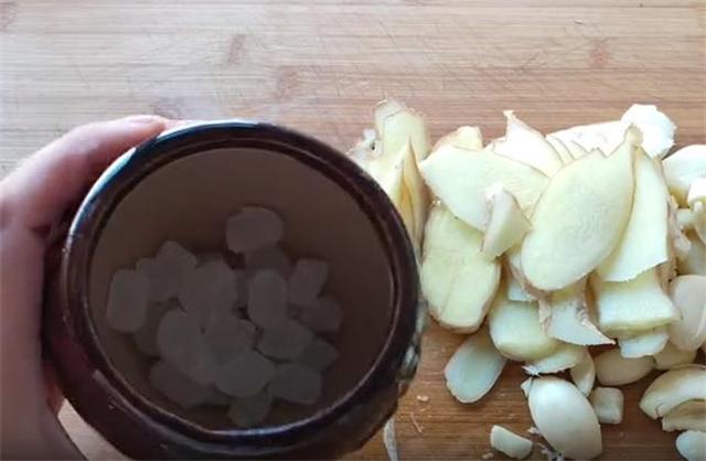 3.接下來我們來準備配料,冰糖30克,大蒜50克,生姜70克,這幾個的比例都可以按照個人喜好來調節,把大蒜拍碎或者切薄片,生姜切大片或者是切絲都可以,然后把冰糖搗碎。