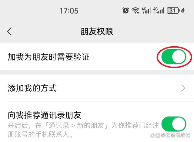 三:設(shè)置好友驗證功能。 在使用微信的過程中,可能很多朋友還遇到過這樣的情況,就是莫名會添加了一些陌生人,而這些陌生人無疑是隱私泄露的一大隱患。其實之所以出現(xiàn)這樣的情況,是因為微信添加好友的默認(rèn)設(shè)置中,好友添加是無需驗證的,這樣陌生人就可以隨意添加,不僅會打擾我們的生活,還可能對我們的信息安全構(gòu)成威脅。那么這個時候,我們就需要將微信好友添加的方式設(shè)置一下了。 具體的操作方法:點擊并進入微信的設(shè)置頁面,然后選擇朋友權(quán)限,接著再將加我為朋友時需要驗證的開關(guān)打開,這樣當(dāng)別人需要添加我們的微信時,就需要通過我們的驗證才能成為微信好友了。它可以有效地防止陌生人隨意添加我們?yōu)楹糜眩Wo我們的隱私和信息安全。
