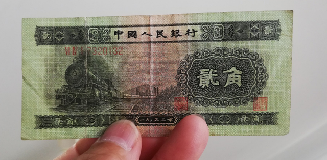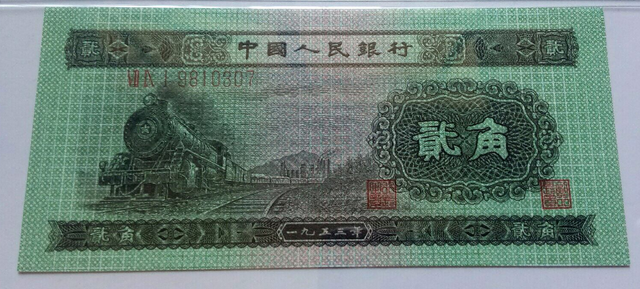 其中第二套人民幣中貳角紙幣是發行于1955年3月1號,到1971年11月份才開始退出流通市場的,錢幣正面是火車頭的圖案也象征這當時工業飛速發展,整體顏色是墨綠色、淺綠色和淺紫色為主,錢幣背面是國徽和花團的形式。這枚貳角紙幣的收藏空間比起后面發行的那兩張來說就要高一些,當時是普通版而且品相差不多的情況下對比。