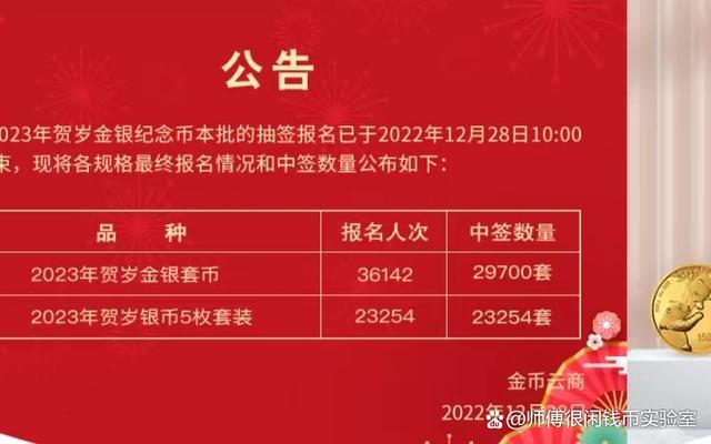 2023年賀歲福字金銀紀念幣金幣云商千抽簽也已經結束,目前銀行渠道也在抽簽當中,從金幣云商的報名情況來看,金銀套裝報名人數36142人,可抽簽數量為29,700套,中簽率為82.12%。8克銀幣5枚套裝報名人數23254人,可抽簽數量為23254套,中簽率為100%。整體來說中簽率還是非常高的,8克銀幣5枚套裝100%中簽符合預期。金銀套裝82.12%的中簽率要高于預期,本來以為可能會在50~60%左右的中簽率。
