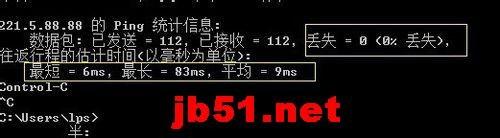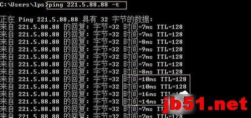 Ping路由器的網關后再Ping 221.5.88.88 -t,這個是聯通的DNS,這個延時會比較大,但不要太過分就是正常的。