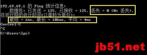 如果想更準確的測試,需要Ping大包或者時間久一些。大概幾分鐘后,按住鍵盤的Ctrl C,終止它繼續Ping下去,一起來看看網絡連接的狀態吧。主要看兩個地方,一是看看有沒有丟包,二是有沒有延時。在圖片丟失率為0,但是有一些延時,不過對于家用的話不算大問題,是正常現象。