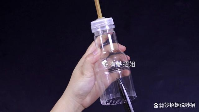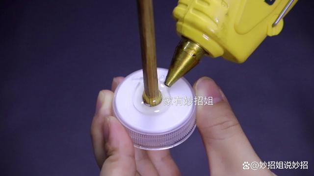 瓶子的底部剪好,我們還需要在瓶蓋的中間部分戳一個洞,洞的大小和筷子一端的大小差不多就可以了。接下來,我們把筷子插在戳好的洞中,并在筷子與洞口的連接處多打點熱熔膠,使筷子牢牢的固定在瓶蓋上面。