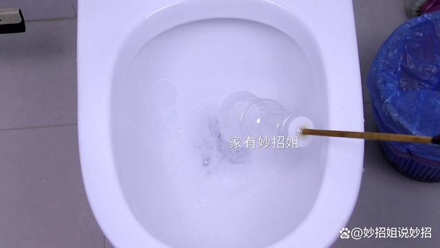 我們只需要抓住瓶子上方的筷子把手,然后把塑料瓶的底部對準馬桶的出水口,由于瓶底被剪成了流蘇狀,稍微用力點,它就會被深入到馬桶口內部一點。接下來,再抓住筷子來回不停的抽動。