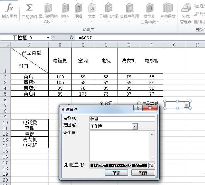 8、再次執行工具-名稱管理器命令,在彈出的對話框中點擊新建命令,接著彈出另一個對話框,輸入名稱為“銷量”,引用位置輸入=if($B$7=1,offset($A$1:$C$7,1,1,5),offset($A$1,1,A$7,4,1)),點擊確定按鈕。