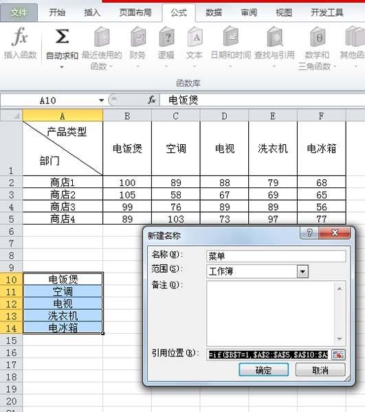 6、執行公式-名稱管理器命令,在彈出的對話框中點擊新建按鈕,彈出新建對話框,在該對話框中輸入名稱為“菜單”,引用位置輸入=if($B$7=1,$A$2:$A$5,$A$10:$A$14),點擊確定按鈕。