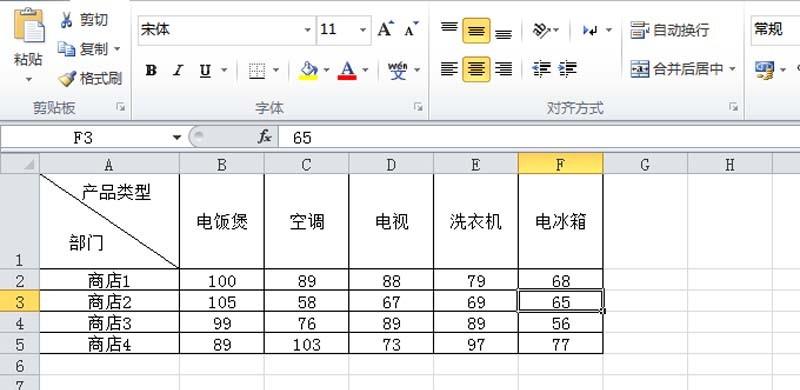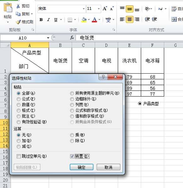 5、采用同樣的方法對“產品類型”選項按鈕進行操作,選擇數據區域b1:f1,執行復制操作,接著在單元格a10中執行選擇性粘貼,選擇轉置,將行轉置為列。