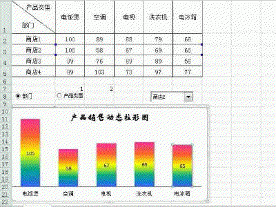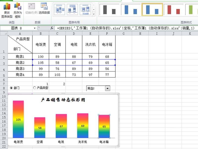 10、選擇數據區域b1:f2,執行插入-圖表命令,在柱形圖中選擇第二個即可,接著根據自己愛好進行美化圖表,并修改圖表的名稱為產品銷售動態柱形圖。