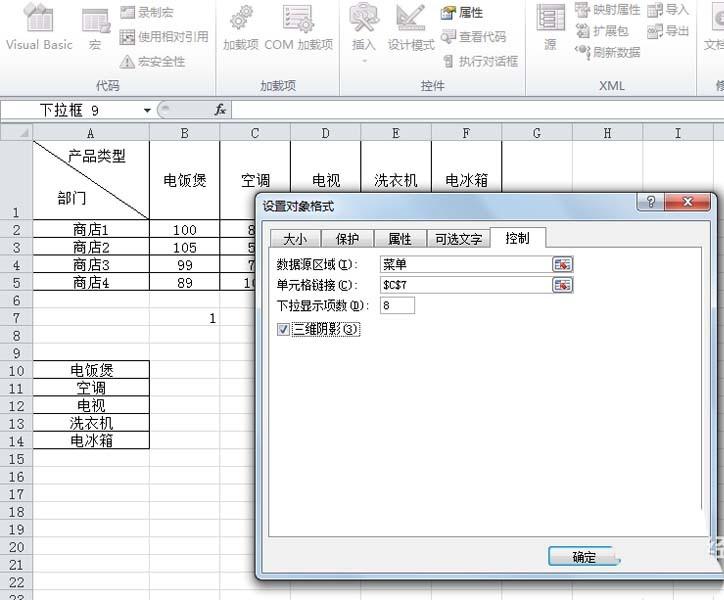 7、執行開發工具-插入-組合框命令,在sheet1上創建一個組合框,右鍵單擊該組合框從下拉菜單中選擇設置控件格式選項,在彈出的對話框中設置數據源區域為菜單,單元格鏈接為$C$7,勾選三維陰影,點擊確定按鈕。