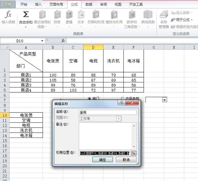 9、采用步驟8建立一個名稱為“坐標”,引用位置為=if($B$7=1,$A$10:$A$14,$A$2:$A$5)名稱管理器。