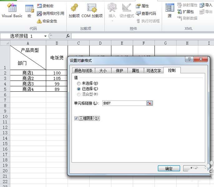 4、右鍵單擊部門選項按鈕,從下拉菜單中選擇設置控件格式選項,接著彈出設置控件格式對話框,在該對話框中設置單元格鏈接為$B$7,勾選三維陰影,點擊確定按鈕。