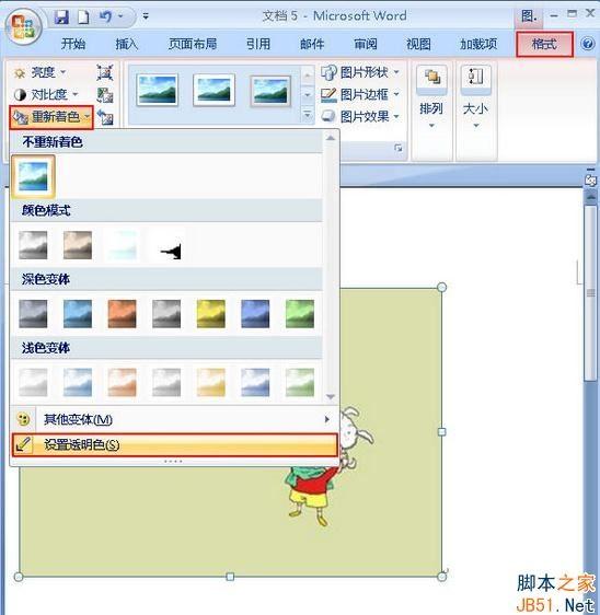2、鼠標單擊該圖片,使其處于選中狀態,單擊“格式”選項卡,選擇“調整”區域中的“重新著色”。在出現的下拉菜單中單擊“設置透明色”;