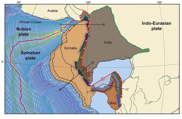 過了1500萬年后,地幔柱再次上升,新的裂谷也隨之產生,即現在我們熟知的東非大裂谷,東非大裂谷再次切割大陸,將努比亞板塊和索馬里板塊分離。 阿爾法洼地現今恰好位于三個板塊的交匯位置,即地幔柱中心的正上方,在周圍不斷遠離彼此的情況下,阿爾法洼地在未來無疑會被徹底撕開。