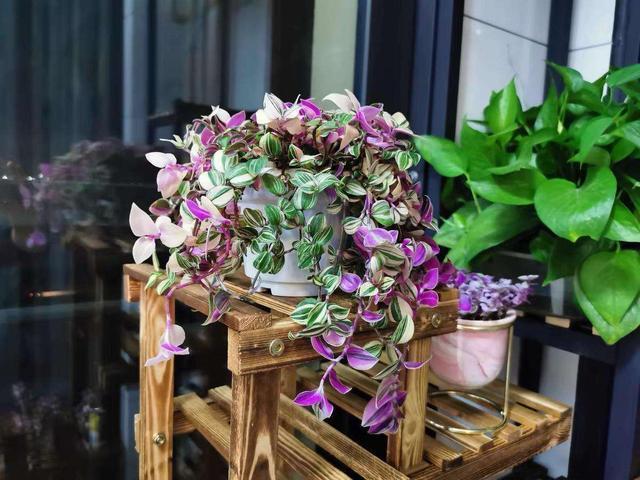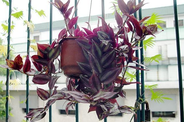 2、幾盆油畫吊蘭 我買了很多盆,但都不是用來懸掛的,現在只剩下最后一盆了,把它懸掛在陽臺上,還別說,長的真不錯,不過不想再扦插了,養一盆也還不錯。 每天坐在陽臺上,都會不經意地看見那一片片紫綠相間的葉子,別具一格,看了幾年都不會覺得膩。 油畫吊蘭喜光,以前插在其他花木中間,因為沒有足夠的陽光,所以很難有好的效果,但現在,油畫吊蘭就跟換了一個盆栽似的,長勢很好,還得時不時地進行修剪。