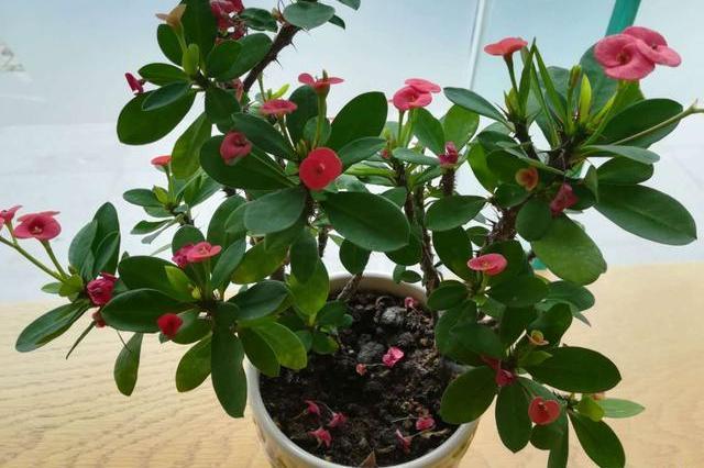 4、一盆虎刺梅 我的那盆虎刺梅,一直都沒有換過土,雖然看起來比以前更茂盛了,但個頭并不大。被關在一個小小的花盆里,它的生長受到了限制,但是它的花朵卻一點都不受影響,一朵又一朵,甚至開得比小木槿還多。 虎刺梅常年開花,需要大量的營養,所以,最好的辦法是每月一次的施肥,如果不是特別需要,可以在在花盆表面挖坑穴施有機肥。