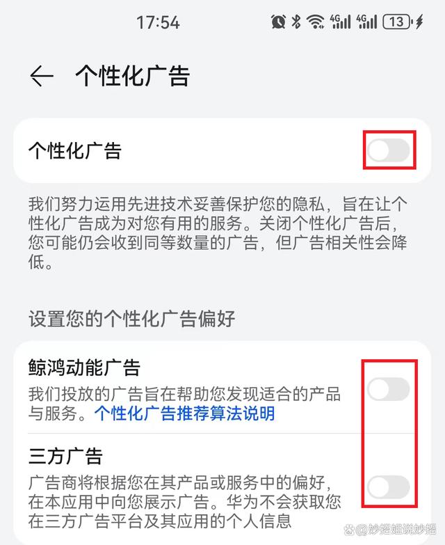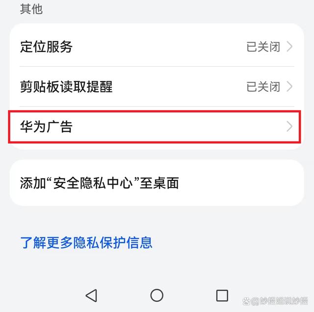 4,關閉智能推薦服務 智能推薦服務的開關如果是開啟的,那么系統就會為我們推薦可能感興趣的商品或服務。關閉的方法很簡單,打開【設置】,點擊【隱私】,進入【華為廣告】,關閉【智能推薦服務】后面的開關就行。