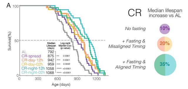 實驗小鼠被分為兩組,對照組可以毫無限制地進食,而另一組小鼠的熱量攝入被限制在平日的30%至40%。與此同時,這些被減少熱量攝入的小鼠還被額外限制了進食時間,一部分在白天進食,而剩下的就在晚上進食。 研究結論指出,相比對照組小鼠隨心所欲地吃,熱量限制組的小鼠壽命直接延長了10%。更令人驚訝的是,實施熱量限制并控制在晚上進食的小鼠,平均壽命更是延長了9個月,這相當于增長壽命35%。