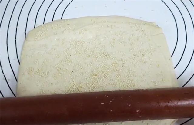 4.刷一層清水,撒上一層白芝麻,按壓緊實,這樣口感會更好。