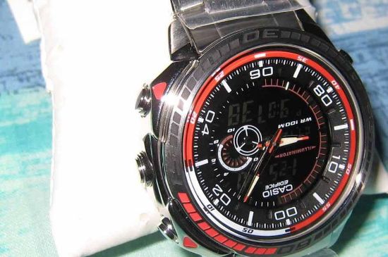 正品卡西歐手表的表殼看起來(lái)比較明亮,其內(nèi)部的底紋清晰可見,并且時(shí)間刻度制作的非常清晰工整。而假的卡西歐手表做工粗糙、色澤暗淡,表盤內(nèi)部的數(shù)字不整齊且比較模糊。 2、看表殼