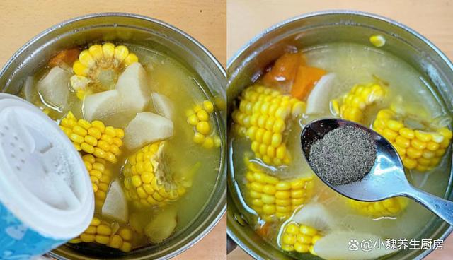 8:大概燉一個(gè)半小時(shí),讓湯汁煮至變色,食材基本上都熟透了,只需要加上胡椒粉和鹽少許,燜煮一會(huì)兒,出鍋食用,這款白蘿卜胡蘿卜玉米燉排骨湯就烹飪完成了。