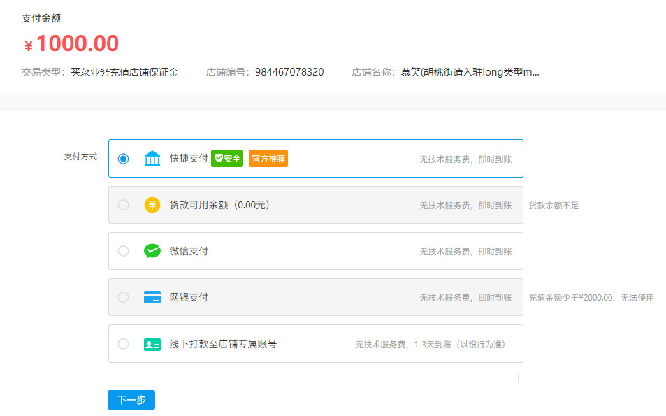 3、在充值頁(yè)面充值即可,支持微信、網(wǎng)銀、貨款余額、快捷支付(使用快捷支付前,需先綁定銀行卡)、線下打款至店鋪專屬賬號(hào)(網(wǎng)銀/銀行轉(zhuǎn)賬、現(xiàn)金匯款)。