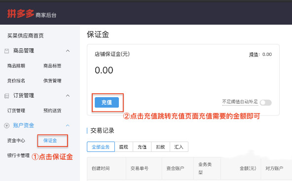 1、打開(kāi)拼多多商家后臺(tái),點(diǎn)擊【多多買菜】進(jìn)入買菜店鋪商家后臺(tái)。在【賬戶資金】-【保證金】進(jìn)入保證金充值頁(yè)面,再點(diǎn)擊【充值】即可進(jìn)行充值。