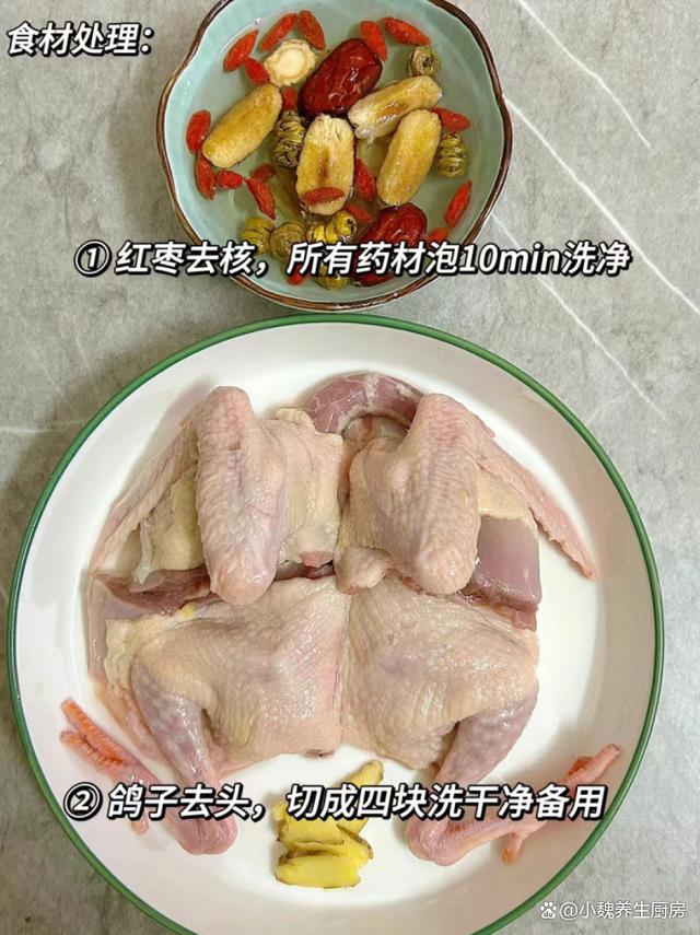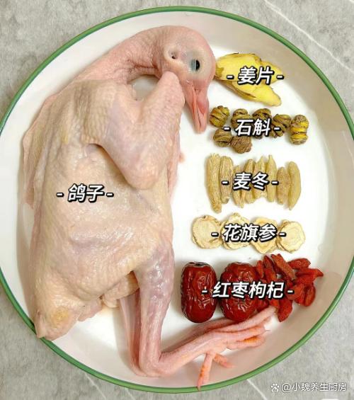 進(jìn)入到2月的最后日子,冬天已經(jīng)要過去了,春節(jié)假期也結(jié)束了,迎來非常繁忙的工作,最近小伙伴們都在曬春節(jié)期間的戰(zhàn)利品,有人瘦了,也有人胖了,朋友圈非常熱鬧。雖然立春節(jié)氣過去很長時(shí)間,但是雨雪天氣沒有結(jié)束,雨雪過后就是暖和和的春天,都是大晴天。春天是一年的開始,是最佳的進(jìn)補(bǔ)“時(shí)機(jī)”,平常要少吃山珍海味,多喝一些湯湯水水,更加利于營養(yǎng)的消化和代謝,為春天儲備能量。春天到了,可以給家里人嘗嘗這款湯品——花旗參石斛鴿子湯,鴿子肉非常鮮嫩,湯品非常滋補(bǔ),營養(yǎng)全面,不懂吃太可惜了。“春季喝湯,勝過吃肉”,平常要多喝這湯,滋補(bǔ)氣血,早食早受益。  【花旗參石斛鴿子湯的正確做法】 詳細(xì)制作順序:選購新鮮乳鴿1-2只(乳鴿又叫肉鴿,是我們?nèi)粘V凶畛R姷氖巢闹唬澴尤夥浅7拭溃赓|(zhì)新鮮嫩滑,非常適合用來煲湯,鴿子湯非常滋補(bǔ),讓氣色更加紅潤,比雞湯更加受歡迎,但是一定記得處理干凈),生姜一大塊,若干個(gè)紅棗或蜜棗,石斛12克左右,麥冬12克左右,冷水和溫開水少許,花旗參20克左右,枸杞子一小把,料酒或白酒少許,食鹽若干,白胡椒粉半勺,其他調(diào)味品。 具體制作順序: 第一步:提前準(zhǔn)備好新鮮鴿子,石斛,紅棗,花旗參和其他食材,先把幾個(gè)紅棗洗干凈,去掉紅棗核,切成若干小塊,備用。 第二步:先把石斛,麥冬和花旗參洗凈,生姜洗凈去皮,切成若干片狀,枸杞子用流水沖洗幾遍,沖洗掉表面的灰塵,控干水分,放在碗中備用。第三步:提前把鴿子處理干凈(主要是去掉表面毛發(fā)),去掉頭尾兩部分,破開鴿子的肚子,丟掉內(nèi)臟洗干凈,用流水沖洗掉表面的血水。 第四步:鴿子剁成一些塊狀,或者用鹽水浸泡,準(zhǔn)備好一個(gè)燉鍋,放入切好的鴿子肉,丟入一些生姜片,加上料酒若干,將鴿子肉焯水處理,逼出里面的血腥物質(zhì),然后用溫水沖洗掉浮沫。 第五步:準(zhǔn)備好煲湯的砂鍋,鍋中放入焯水好的鴿子肉,放入一些紅棗塊,石斛,花旗參和麥冬。 第六步:加上適量純凈水或開水,用勺子撇去浮沫,轉(zhuǎn)至中小火燉煮,大概燉煮一個(gè)半小時(shí)。 第七步:讓幾種食材都燉至熟透,湯汁變成黃色,出鍋前丟入枸杞子,加上食鹽和白胡椒粉,蓋上鍋蓋繼續(xù)燜煮,關(guān)火盛出,這道花旗參石斛鴿子湯就烹飪完成了。 花旗參石斛鴿子湯是一款大補(bǔ)的湯品,頗受南方人的喜歡,主要選用鴿子肉,石斛,花旗參等食材燜煮而成,鴿子湯比雞湯更鮮美滋補(bǔ),具有補(bǔ)血養(yǎng)氣,補(bǔ)腎益氣,調(diào)理肝火的目的,早食早受益。