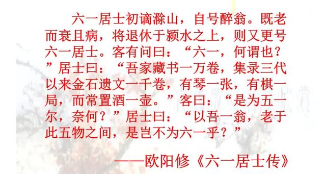 六一居士的六一指的是:1、藏書一萬卷;2、金石遺文一千卷;3、琴一張;4、棋一局;5、常置酒一壺;6、加上歐陽修自己。