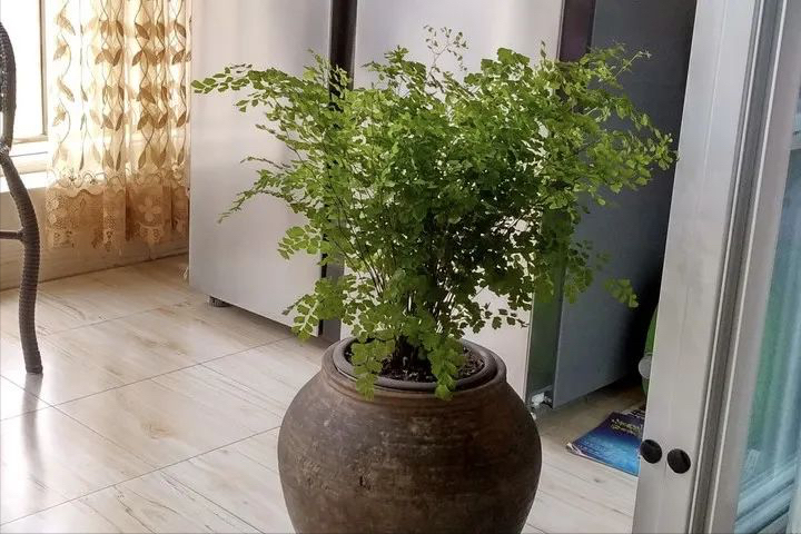 在蕨類植物當中,鐵線蕨是一個比較亮眼的存在,它的葉片很瀟灑,很飄逸,用手去觸摸,就像美女的秀發,特別柔軟,搭配一個白色的圓桌擺放在一起,清新悅目,十分美麗,使家居環境簡單也時尚。