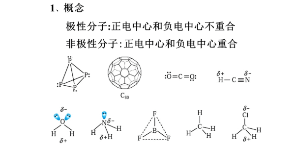 分子中正負電荷中心不重合,從整個分子來看,電荷的分布是不均勻的、不對稱的,這樣的分子為極性分子,以極性鍵結合的雙原子分子一定為極性分子,極性鍵結合的多原子分子視結構情況而定。