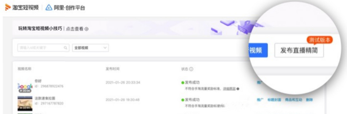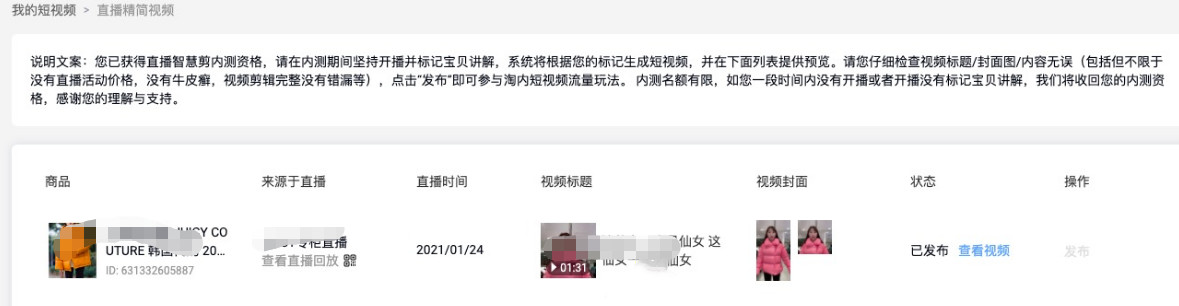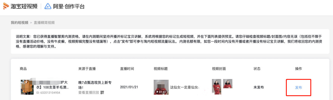第三步:系統根據直播講解標記生成的短視頻,均在下面列表提供預覽。請仔細檢查視頻標題/封面圖/內容無誤(包括但不限于沒有直播活動價格,沒有牛皮癬,視頻剪輯完整沒有錯漏等),點擊“發布”即可參與淘內短視頻流量玩法。