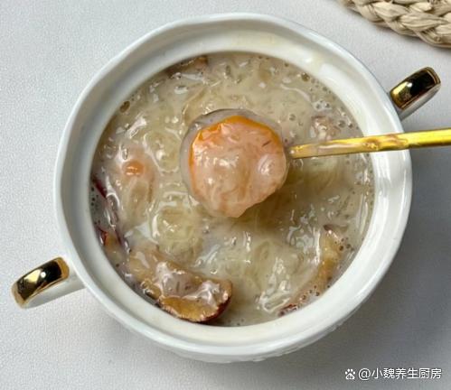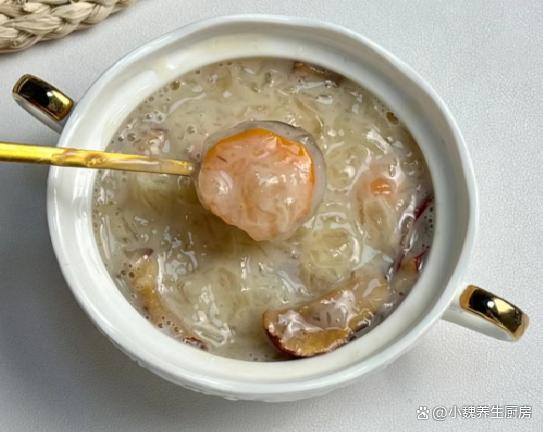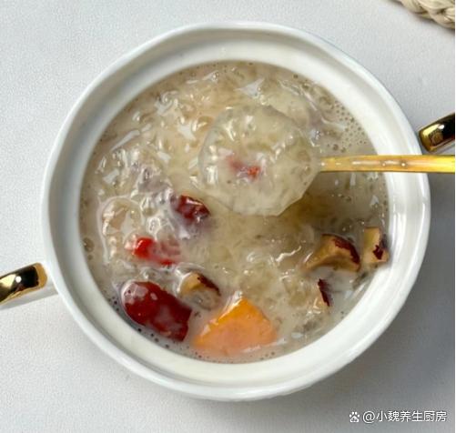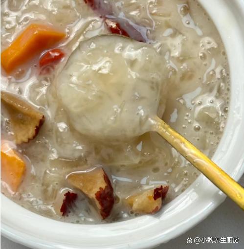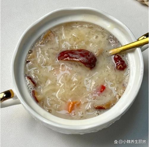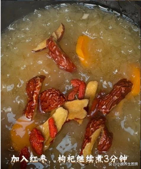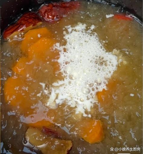 5:蓋上鍋蓋燜煮30分鐘,放入一些紅棗和枸杞子,讓銀耳燜煮出膠質,羹湯變得非常濃稠,用勺子迅速攪拌。 6:倒入150毫升牛奶,加上一些老冰糖,繼續小火熬10分鐘,盛出放置溫熱,關火盛出,這款紅薯牛奶銀耳羹就烹飪完成。 紅薯牛奶銀耳羹是一款巨好喝的美容甜湯,主要選用紅薯,銀耳和紅棗制作而成,里面添加了牛奶,讓湯汁香甜軟糯,濃郁的膠原蛋白,每周可以喝幾次,水嫩肌膚,氣色越來越好。