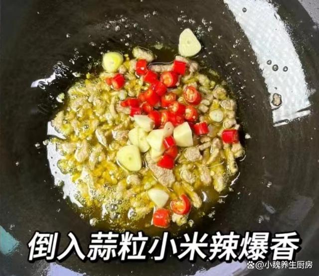 步驟6:鍋中加上食用油少許,滑入腌制好的豬肉,將其炒至變色,放入一些小米辣和蒜片,用鍋鏟翻炒均勻。