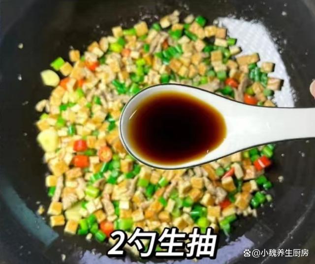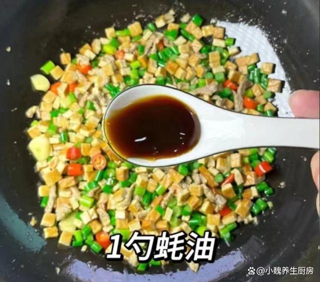 步驟7:加上一些香干丁和蒜苔,加上兩勺生抽,一勺蠔油,加上一丟丟食鹽和白糖,加上雞精半勺,用鍋鏟快速翻炒一會兒。
