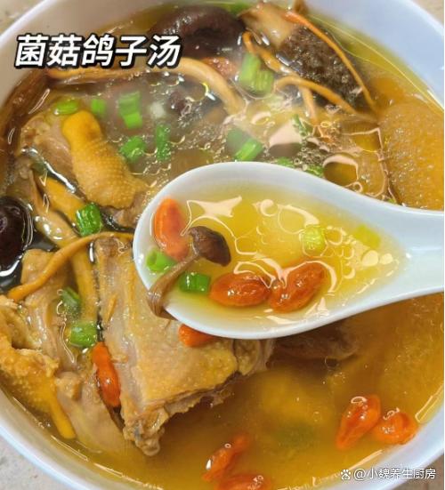 第五步:提前準(zhǔn)備好砂鍋,鍋中放入鴿子肉,放入姜片和蔥段,丟入一些紅棗,放入泡好的菌菇和香菇,一次性加上適量純凈水。 第六步:先把湯汁煮至沸騰,蓋上鍋蓋小火燉一個(gè)小時(shí),讓湯汁變色,出鍋前加上少許食鹽調(diào)味,加上胡椒粉半勺,放入一些枸杞子,燜煮一小會(huì)兒。 第七步:放入一些蔥花點(diǎn)綴,關(guān)火出鍋,這道菌菇紅棗鴿子湯就制作完成了。 小貼士:1. 鴿子可以選擇老鴿或者乳鴿,老鴿燉湯更加滋補(bǔ),乳鴿則更加鮮嫩。2. 菌菇可以選擇自己喜歡的種類,但最好選擇品質(zhì)有保障的品牌,以保證食品安全。3. 燉湯時(shí)最好選擇砂鍋或者瓦煲,這樣能夠更好地保留食材的營養(yǎng)成分和原汁原味。 菌菇紅棗鴿子湯是一款超級(jí)鮮美的家常湯品,是進(jìn)補(bǔ)的不錯(cuò)選擇,菌菇和鴿子燉湯喝,喝起來非常鮮美,補(bǔ)氣活血,養(yǎng)肝明目 ,對(duì)身體有很多好處。 網(wǎng)友們,你們是否喝過這款菌菇紅棗鴿子湯呢?(文中的配圖全部出自網(wǎng)絡(luò))www.ws46.com