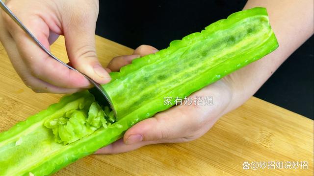 方法很簡單,第一就是處理苦瓜中間的瓜瓤,將瓜瓤挖掉后,邊緣的白色筋膜也不要忽視了,它是非常苦的。為了更方便將這個白色筋膜挖干凈,我們可以選擇拿個不銹鋼的勺子來挖,直到將白色的部分全部挖干凈就可以了。