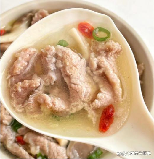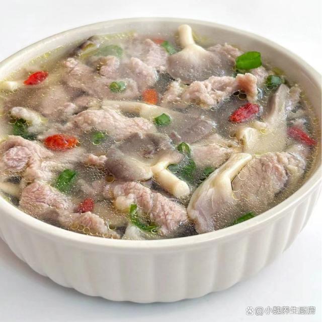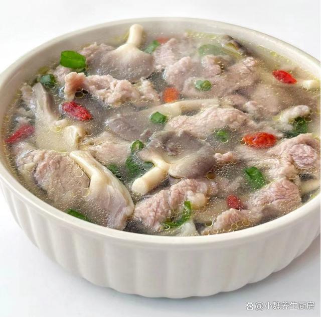 隨著時間的快速推進,2023年就要結束了,很多人已經在總結今年的成績,開始向往著2024的未來,到了12月的月底,處于一年中最冷的時候,寒風凜冽,雨雪天氣到來了,冷空氣席卷南北方,我們稍微不注意,就會被凍傷了,身體會十分虛弱。冬天天氣轉涼了,我們要多穿一些厚衣服來御寒,我們要參加一些有氧運動,少熬夜加班,不建議吃辛辣和性寒的食物,多喝各種熱乎乎的鮮湯,給人帶來溫暖的感覺,更利于營養的消化,讓人更有精神。今天分享一款家常湯品——袖珍菇肉片枸杞湯,食材非常簡單,簡單煮一鍋,營養又美味,別不懂吃。“寒冬喝一湯,身體更舒坦”,建議多喝這湯,暖心暖胃,增強免疫。  【袖珍菇肉片枸杞湯的食譜解析】 挑選一些食材:選購新鮮蘑菇200克(蘑菇是很多食用菌的統稱,袖珍菇是一種個頭較小的菌菇,鮮嫩細膩,用來煮湯能夠增添湯品的鮮味),選購新鮮梅花肉320克左右(梅花肉是豬肉最受歡迎的部位之一,肉質特別鮮嫩,價格也不高,能夠做成許多美食,肉片需要提前腌制處理),若干片老姜,若干根香蔥,少許紅薯淀粉,食用油和輔食油少許,少許食鹽,半勺料酒,生抽醬油少許,枸杞子少許,雞精半勺,一小勺白胡椒粉,其他。 正確做法: 1:提前準備好袖珍菇,梅花肉和枸杞子,先把老姜去皮洗凈,切成若干細絲,香蔥去掉黃葉洗凈,切成若干小段,備用。2:把袖珍菇放在容器里,加上冷水和食鹽浸泡,泡出里面的臟東西,撈出控干水分,撕成一些小朵,備用。