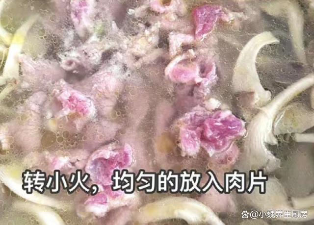 3:先把梅花肉徹底洗凈,一定要順著紋路切成薄片,肉片不能切太厚,肉片放在碗中,加上一些生姜絲,調入半勺料酒去腥,加上一勺紅薯淀粉,加上食鹽少許,滴入一些輔食油,滴入少許清水,用手快速抓拌均勻,至少腌制20分鐘。 4:鍋底繼續加上植物油,慢慢將油溫燒熱,放入生姜絲和蔥花,迅速煸炒一會兒。 5:倒入袖珍菇炒至變軟,加上適量清水,蓋上鍋蓋煮3分鐘,揭開鍋蓋能夠聞到香味。 6:轉至小火燉煮,均勻下入腌制入味的肉片,肉片燙熟至變色,調入一小勺味極鮮提鮮,加上雞精和食鹽調味,加上半勺白胡椒粉,用勺子攪拌均勻,煮2分鐘左右。