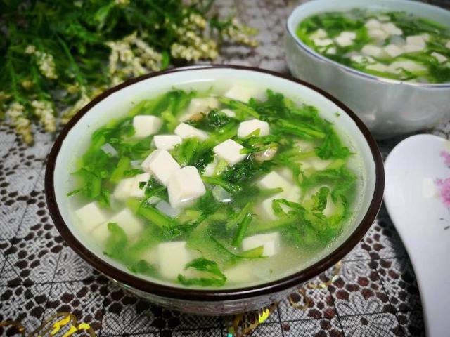 熱鍋涼油,放入大蒜片爆香。 二、茼蒿豆腐湯 做法: