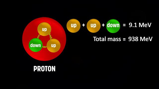 強力最重要的一個方面是,幾乎所有原子的質量都來自于量子色動力學,而不是希格斯場。我們以質子為例,質子由兩個上夸克和一個下夸克組成。希格斯場負責給夸克提供靜止質量,這種情況下兩個上夸克和一個下夸克總質量是9.1MeV。但測得的質子質量為983MeV,所以它的重量是它的組成粒子的100倍,這些額外的質量從何而來?