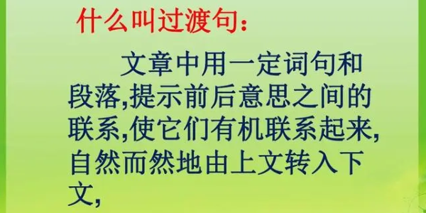 過渡句就是連接上下文,由一個問題過渡到另一個問題的句子。過渡句是一種常見的句式,一般在作文里出現(xiàn),在兩個內(nèi)容的接駁處之中,起到承上啟下的作用,例如:古往今來的成功之士原本都是默默無聞,甚至飽受摧殘,但他們沒有抱怨,經(jīng)過努力終于發(fā)出了自己的光芒。
