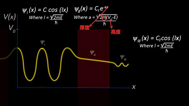 使用薛定諤方程可以找到電子的波函數,它使我們有可能在任何位置找到它。因此,讓我們仔細研究一下,弄清楚它如何向我們展示在盒子外找到電子的可能性。 現在,我們可以求解這個盒子里粒子的波函數。它可以分為三個部分,盒子內、壁板內和盒子外,如下圖。事實上,盒子外的波函數與盒子內的相同,只不過振幅小得多。前面講過,波函數的平方代表了找到粒子的概率,只要盒子外的波函數非零,我們就可以在盒子外找到電子的存在。