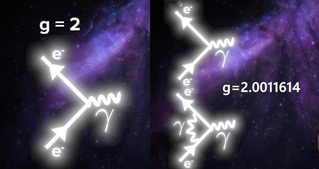 我們可以用最簡單的費曼圖來表示與磁場相互作用的電子:有一個電子被來自該場的單個光子偏轉,如果僅從這種最簡單的情況計算g因子,則得到的值恰好為2。但是還有其他方式可以發生這種交互,較為簡單的方式是電子在吸收光子之前就已經先發生光子了,然后再重新吸收發射的光子。添加此交互作用之后,朱利安·施溫格可以計算出稍高的g值為2.0011614。